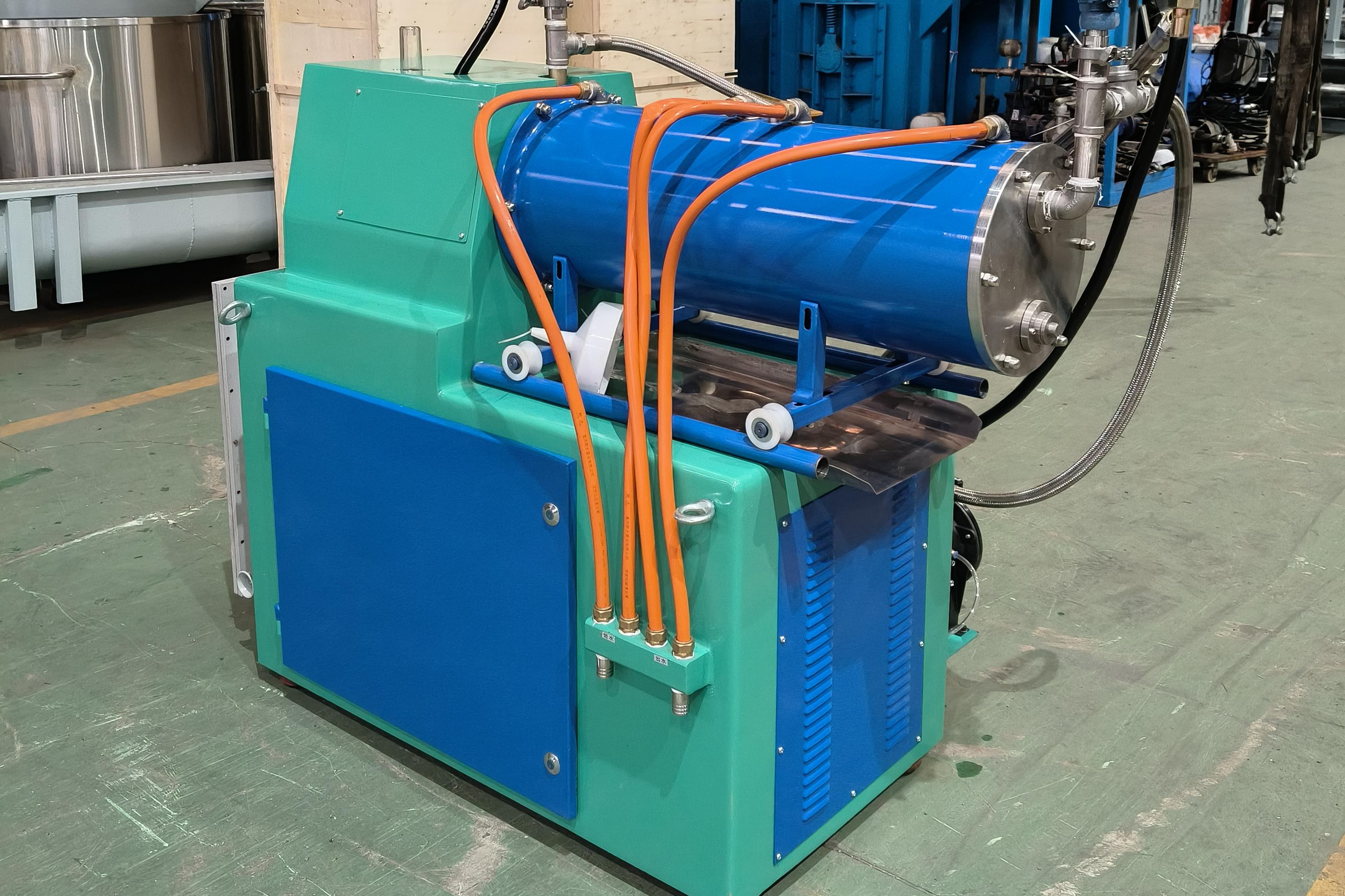 銳通NCE-15型高效率臥式砂磨機適用于小批量,精細化物料的研磨,高效的冷卻系統以及多間隙離心分離系統,使得物料不會因分離器堵塞而造成出料不暢。主要應用于顏料、染料、色漿、農藥、水性涂料、化妝品、非金屬礦等行業的高效率濕法研磨